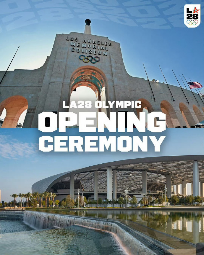 2028年7月14日,洛杉矶纪念体育场与英格尔伍德体育场将共同举办本届奥运会的开幕式。建成于1923年的洛杉矶纪念体育场是美国最负盛名的体育场之一,曾举办1932年和1984年两届奥运会开幕式,如今将第三次成为奥运会开幕式场地;英格尔伍德体育场于2020年9月正式启用,是洛杉矶本地最现代化的体育场馆,是美国职业橄榄球大联盟洛杉矶公羊队和洛杉矶闪电队的主场。