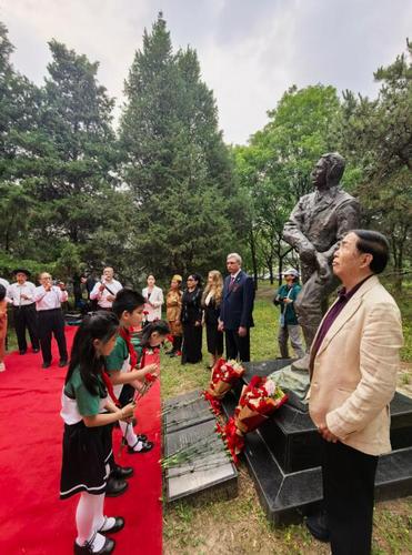 首先,所有来宾一同来到朝阳公园金台艺术馆国际名人雕塑园,依次向袁熙坤馆长应邀创作并安放在此的《苏联飞鹰》雕塑敬献鲜花。