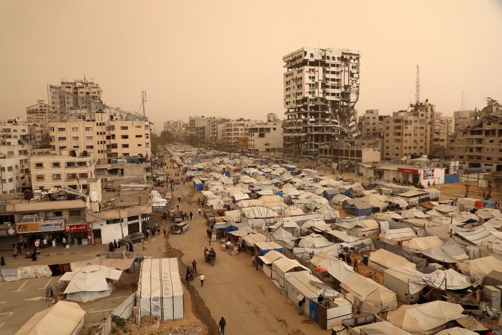 这是4月30日在加沙城拍摄的沙尘天气下的流离失所者聚集区。新华社发(里泽克·阿卜杜勒贾瓦德摄)
