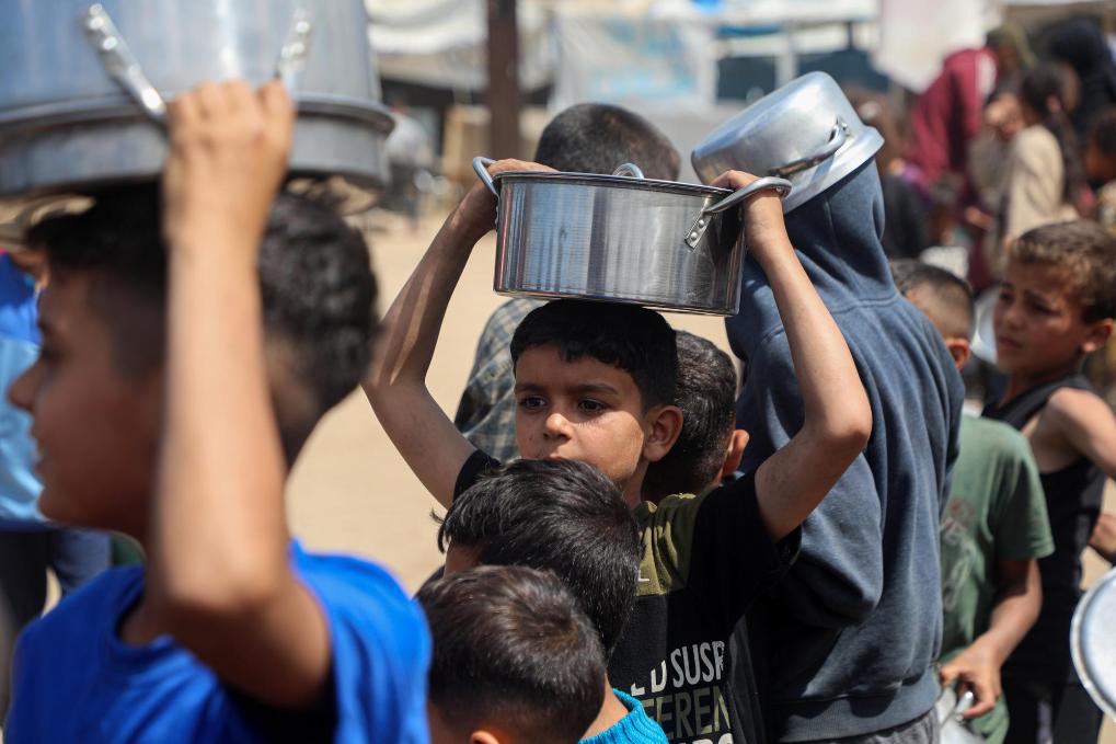 5月2日,孩子们在加沙城等待领取救助食物。新华社发(里泽克·阿卜杜勒贾瓦德摄)