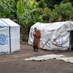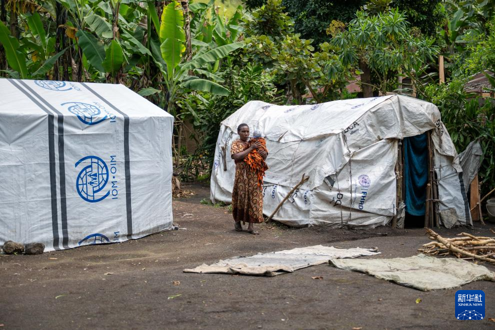 5月11日,在刚果(金)东部小镇萨凯,一名抱着孩子的女子走在帐篷旁。
