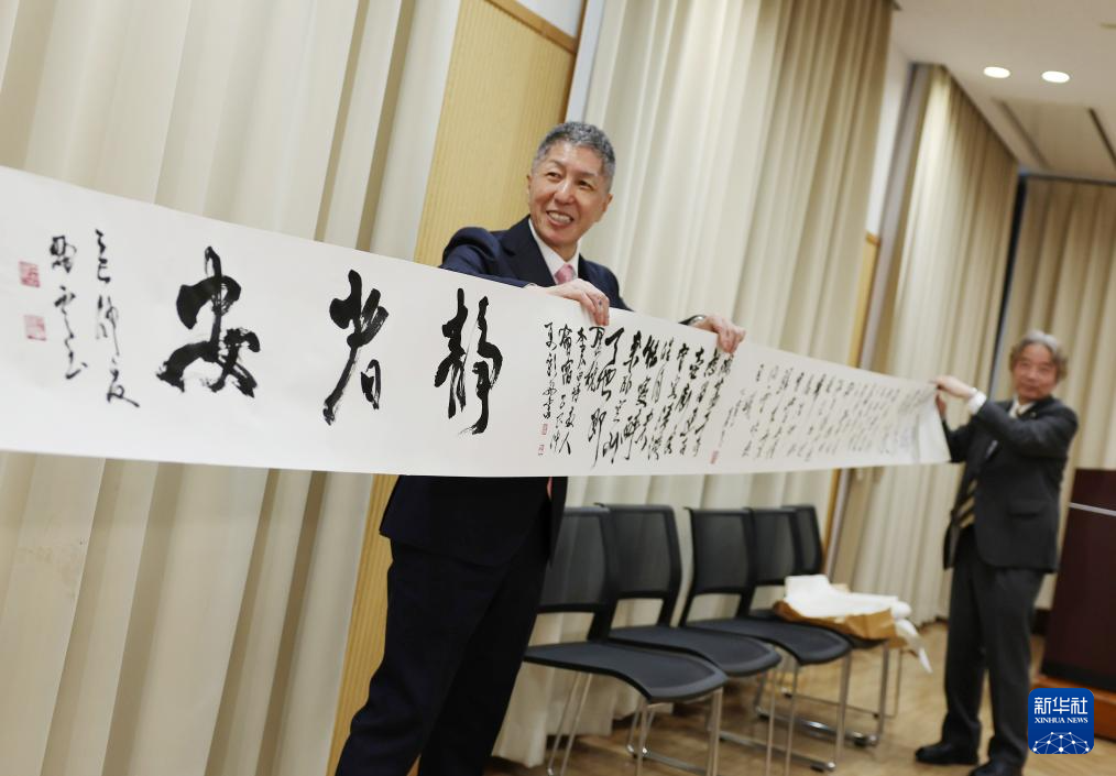 这是5月12日在日本东京拍摄的由日本书法家在第四届东京·北京友好书法交流会创作的长卷书法作品。新华社记者 贾浩成 摄