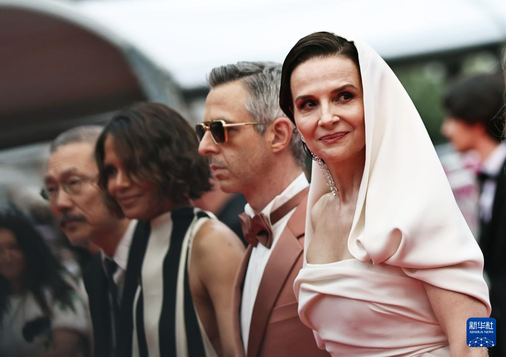 5月13日,在法国戛纳举行的第78届戛纳国际电影节上,主竞赛单元评委会主席朱丽叶·比诺什(右一)携评委亮相开幕式红毯。新华社记者 高静 摄