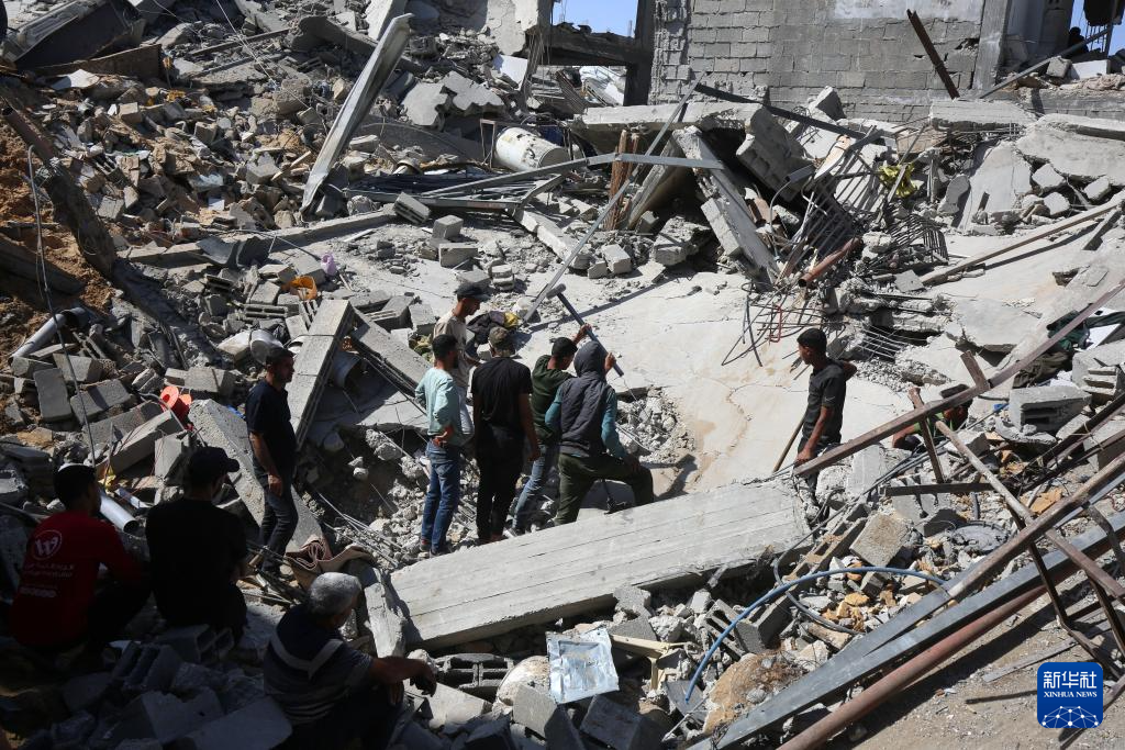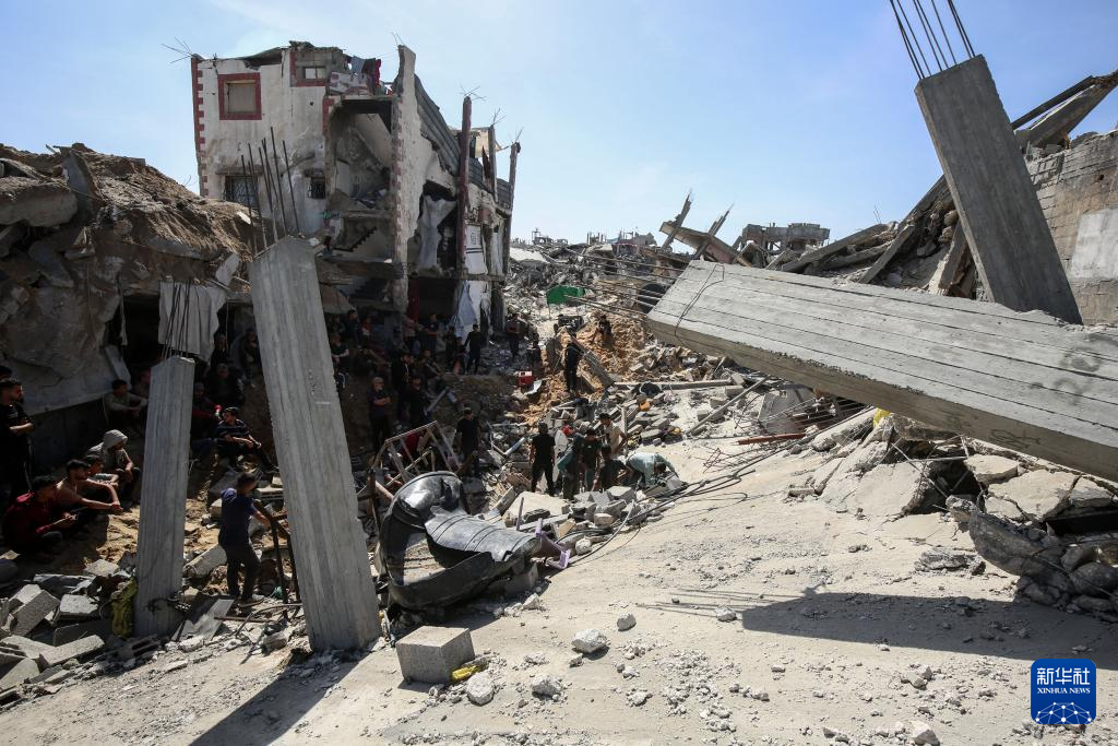 5月16日,在加沙地带北部杰巴利耶难民营,人们查看以军袭击后的建筑废墟。新华社发(里泽克·阿卜杜勒贾瓦德摄)
