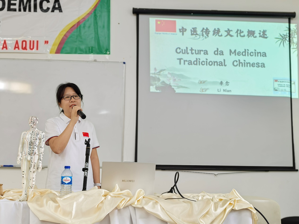 5月21日,在第19批援圣多美和普林西比中国医疗队与圣普大学孔子学院联合举办的“中国传统文化讲座”上,李念医生讲述阴阳五行、经络腧穴等中医核心理念。