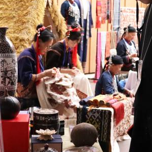 5月23日,游客在大阪世博会中国馆内参观海南黎族传统纺染织绣技艺。