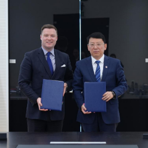 5月26日,在哈萨克斯坦首都阿斯塔纳,中国政法大学党委书记姜泽廷(右)和阿斯塔纳国际金融中心法院和国际仲裁中心首席执行官克里斯托弗·坎贝尔-霍尔特签署合作备忘录后合影。新华社发(奥斯帕诺夫摄)