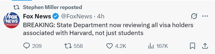 ——当地时间28日,美国福克斯新闻网援引美国国务院一名高级官员的话报道,美国国务院正在审查与哈佛大学关联的所有美国签证持有人,不仅涉及学生签证,还包括B-1(商务)、B-2(旅游)等其他类型签证,“旨在发现签证系统的潜在安全漏洞或其他滥用行为”。美国白宫办公厅副主任斯蒂芬·米勒在社交媒体上转发这一报道。
