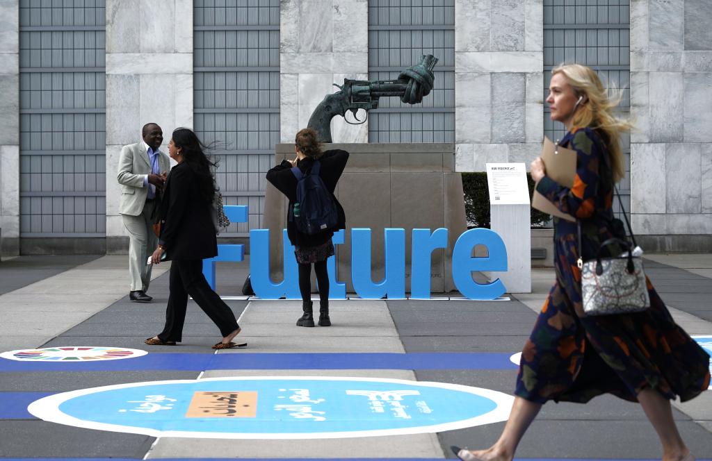 2024年9月23日,在位于纽约的联合国总部,与会者从联合国未来峰会会场外走过。新华社记者吴晓凌摄