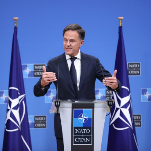 2024年10月1日,在位于比利时布鲁塞尔的北约总部,北约新一任秘书长马克·吕特在新闻发布会上讲话。新华社记者赵丁喆摄