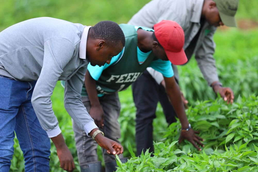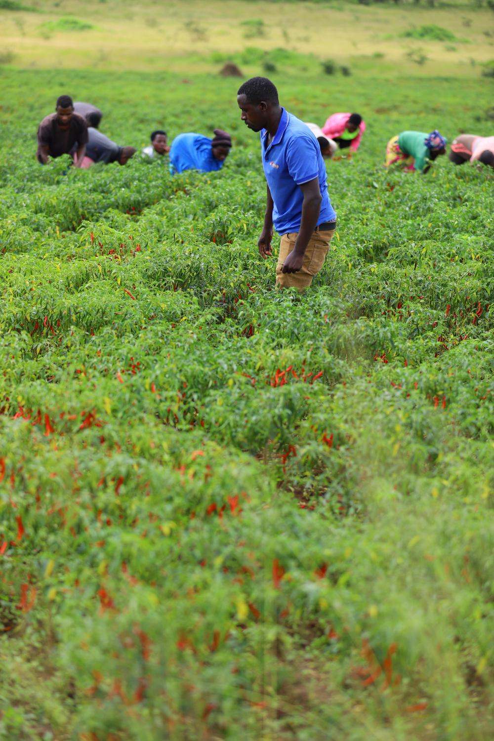 ↑5月22日,卢旺达加绍拉农场员工查看辣椒长势。
