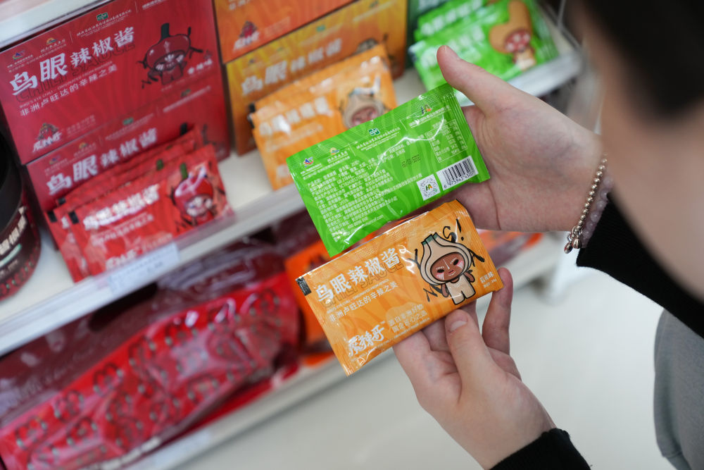 ↑6月6日,在湖南省长沙市一家便利店,顾客挑选卢旺达辣椒酱产品。