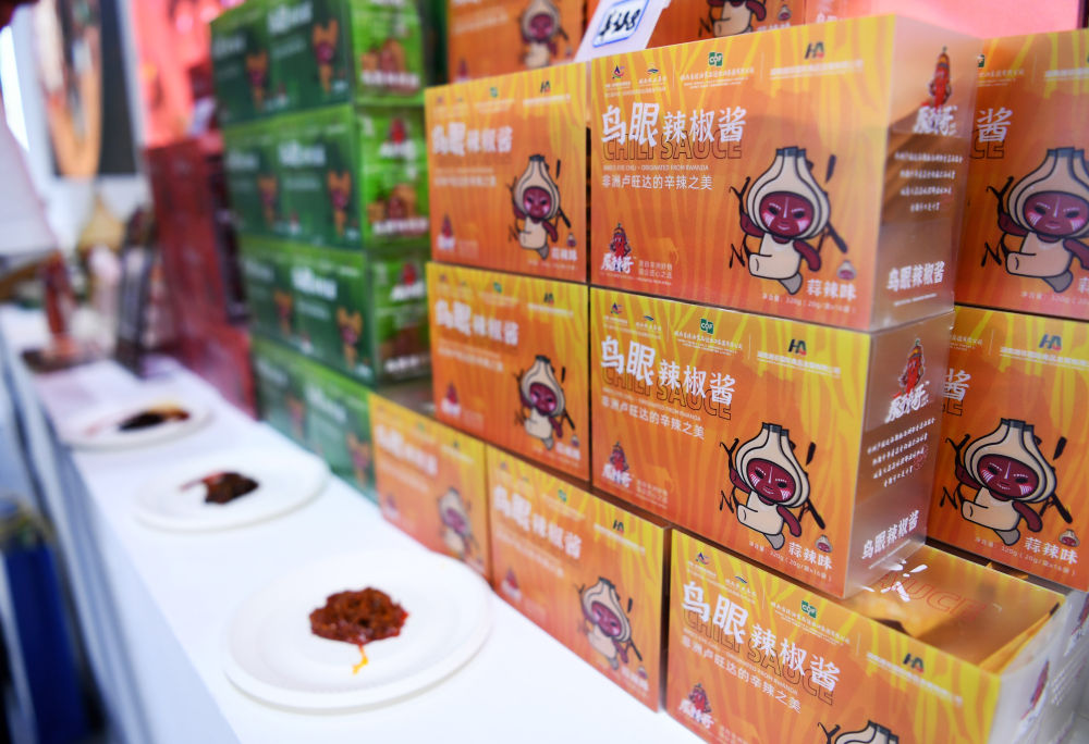 ↑这是6月12日在第四届中国—非洲经贸博览会上拍摄的卢旺达辣椒酱产品。