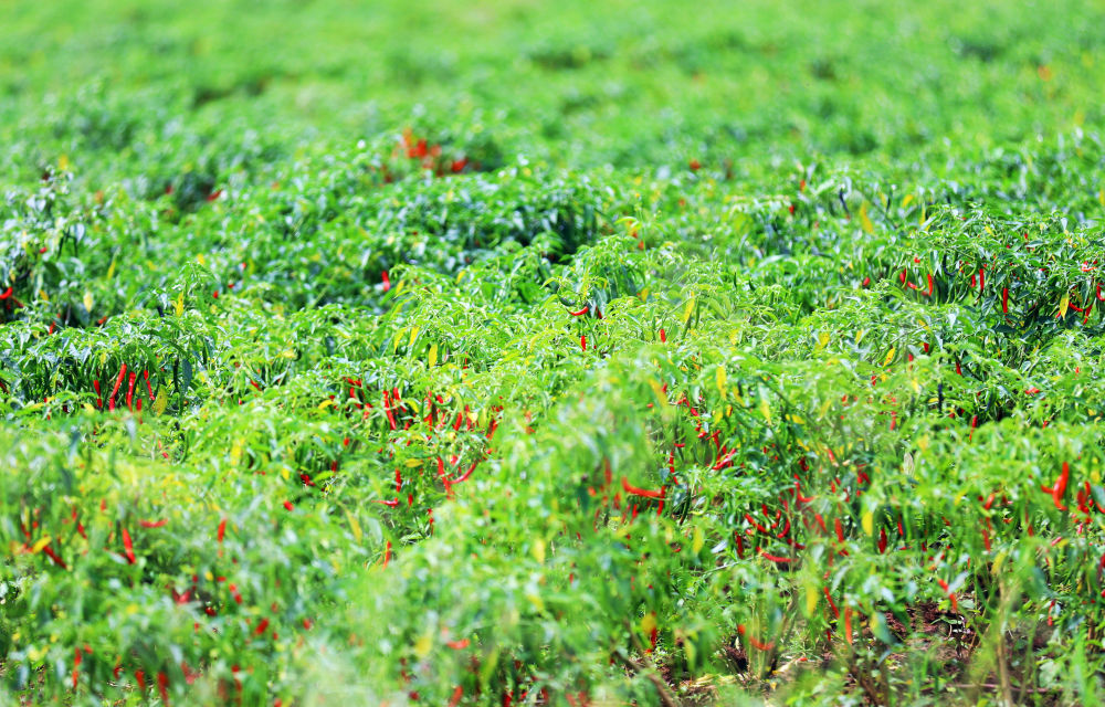 大片火红的辣椒在绿叶间轻轻摇曳