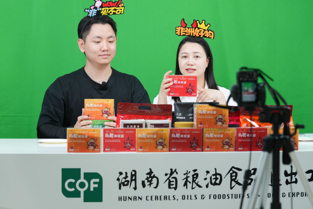 ↑6月5日,在湖南省粮油食品进出口集团,主播为卢旺达辣椒酱产品直播带货。