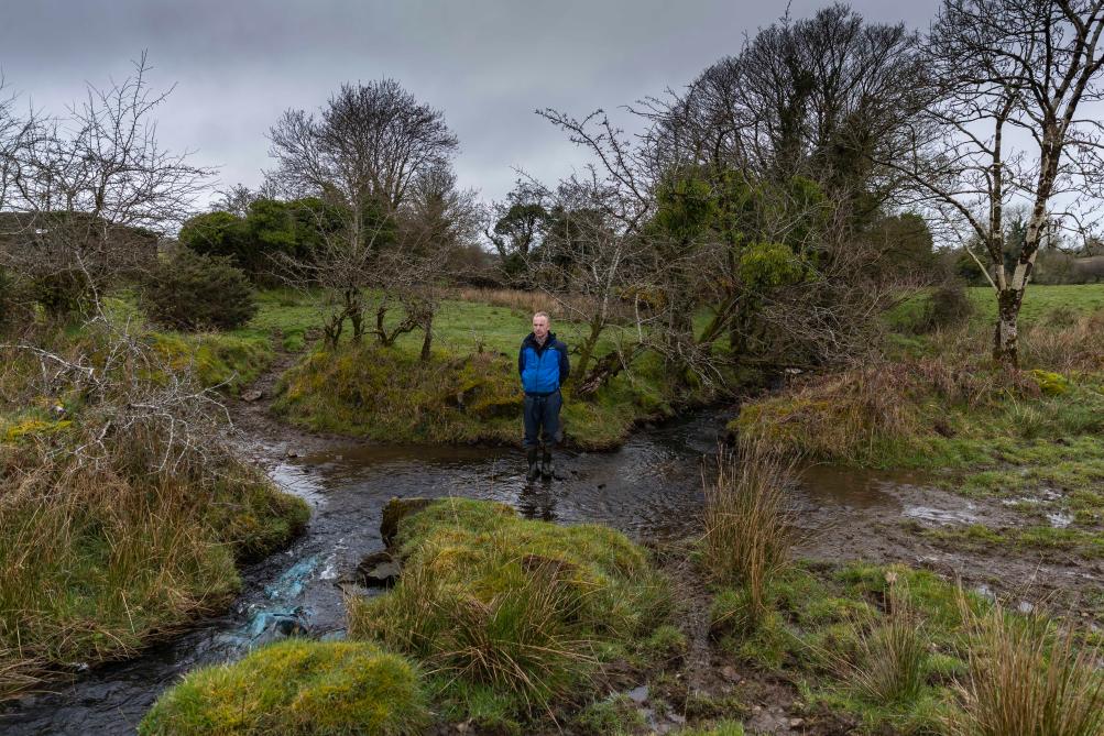 2019年3月19日,里纳甘站在自家农场的小溪中间。这条小溪是英国北爱尔兰地区和爱尔兰共和国边界线的一部分。