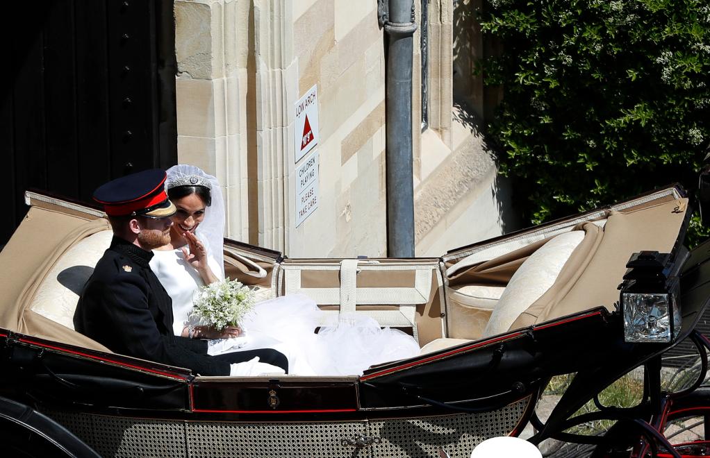 2018年5月19日,在温莎城堡,英国哈里王子(左)与妻子梅根·马克尔在婚礼仪式结束后乘坐马车进行巡游。