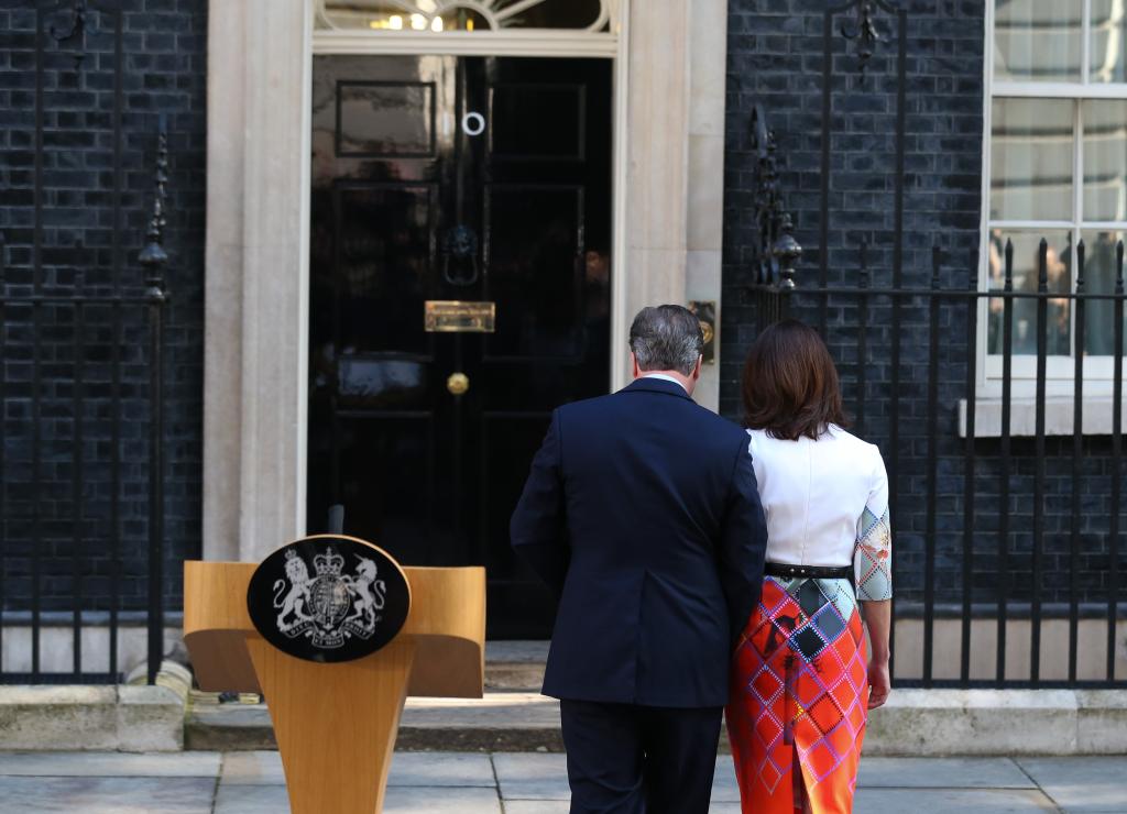 2016年6月24日,卡梅伦(左)发表讲话后与夫人萨曼莎返回首相府。