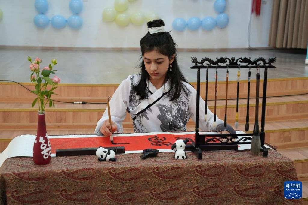 6月13日,在阿塞拜疆巴库,一名选手参加第18届“汉语桥”世界中学生中文比赛。新华社发(胡姆贝尔·马马多夫摄)