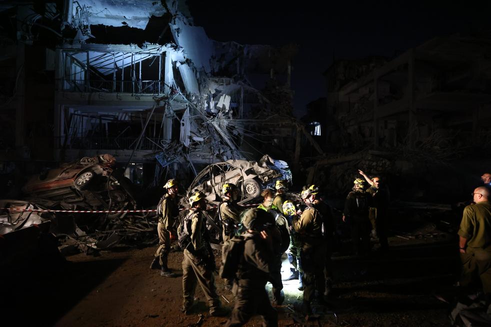 6月13日晚,应急人员在以色列中部一处被导弹袭击的地点开展救援工作。新华社发(贾马尔·阿瓦德摄)