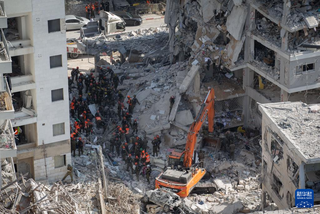 6月15日,在以色列中部巴特亚姆市的一处导弹袭击现场,应急和救援人员搜寻废墟下的人员。