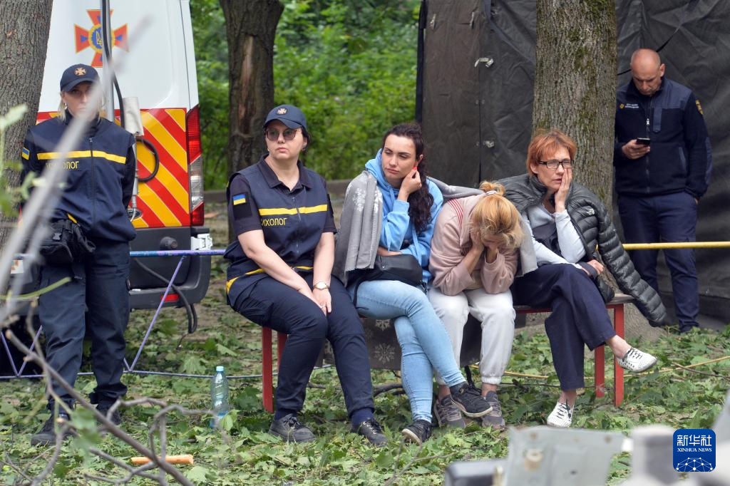 6月17日,在乌克兰基辅市索洛缅斯基区,当地居民在乌克兰国家紧急情况局工作人员陪同下等待失踪亲人的消息。 新华社发(彼得·德鲁克摄)