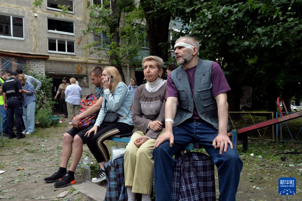6月17日,在乌克兰基辅市索洛缅斯基区,当地居民在空地等待救助。 新华社发(彼得·德鲁克摄)