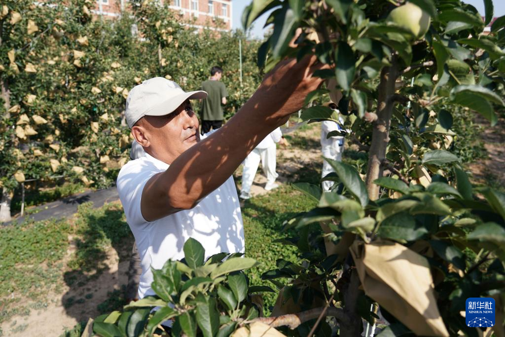 6月16日,培训班学员在位于陕西省渭南市白水县的西北农林科技大学苹果试验站体验苹果套袋。
