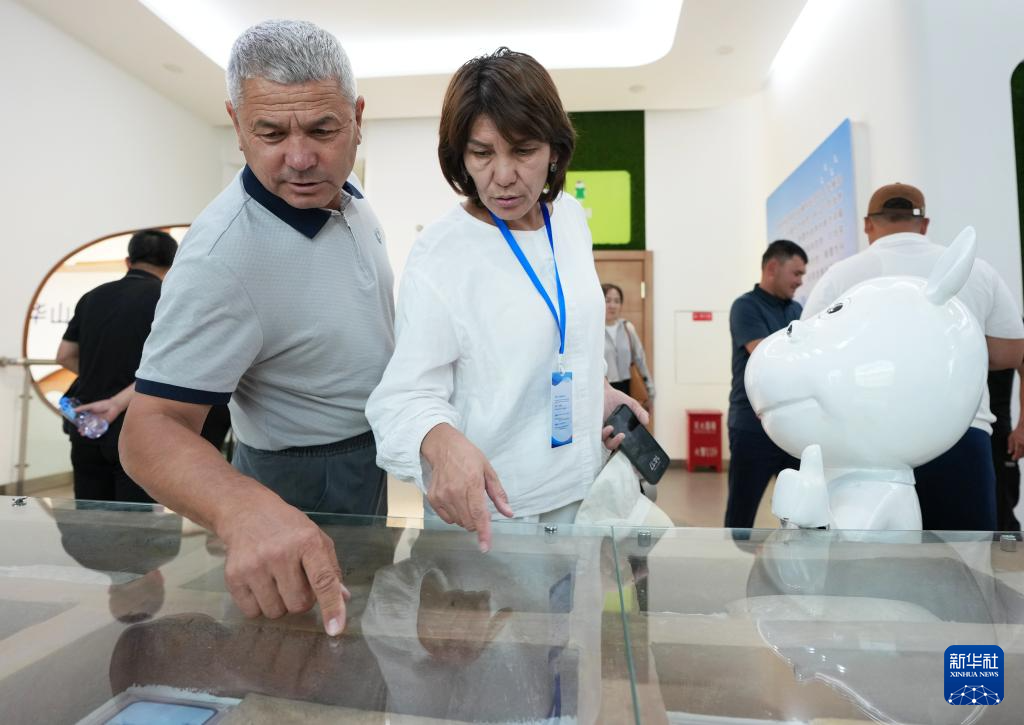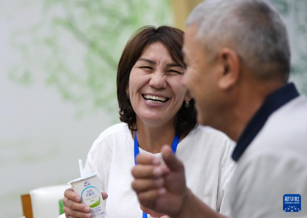 6月17日,培训班哈萨克斯坦籍学员绍哈耶娃·萨吾丽(左)和乌巴耶夫·阿尔济马特在位于陕西省渭南市的中垦华山牧乳业有限公司品尝乳制品。