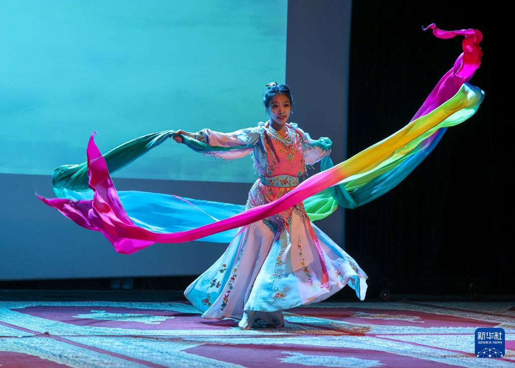 6月19日,在摩洛哥北部城市梅克内斯,广州粤剧院的演员表演长绸舞蹈。新华社记者 霍晶 摄