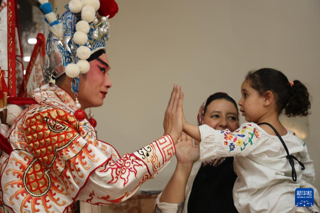 6月19日,在摩洛哥北部城市梅克内斯,广州粤剧院的演员与一名摩洛哥小观众击掌互动。新华社记者 霍晶 摄