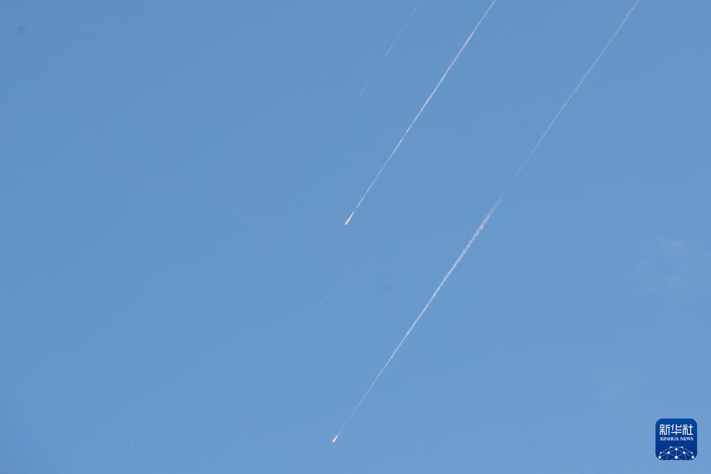6月22日,在耶路撒冷,防空系统发射拦截弹留下烟轨。新华社记者 陈君清 摄