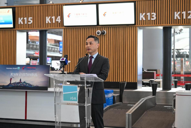 当日上午,由伊斯坦布尔出发航班的首航仪式在伊斯坦布尔机场举行。中国驻伊斯坦布尔总领馆副总领事吴健在致辞中表示,新航线的开通为两座历史名城之间搭建了更加便捷的“空中丝绸之路”,将有力推动两国经贸往来和人文交流,助力“一带一路”合作不断深化。
