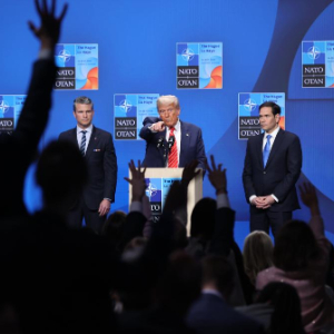 6月25日,在荷兰海牙,美国总统特朗普(中)在北约峰会后出席记者会。新华社记者赵丁喆摄