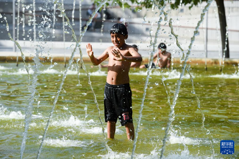 6月29日,小男孩在西班牙马德里的公园喷泉里戏水。