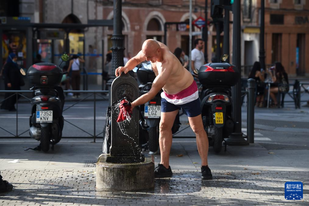 6月29日,一名市民在西班牙马德里的街头接水。