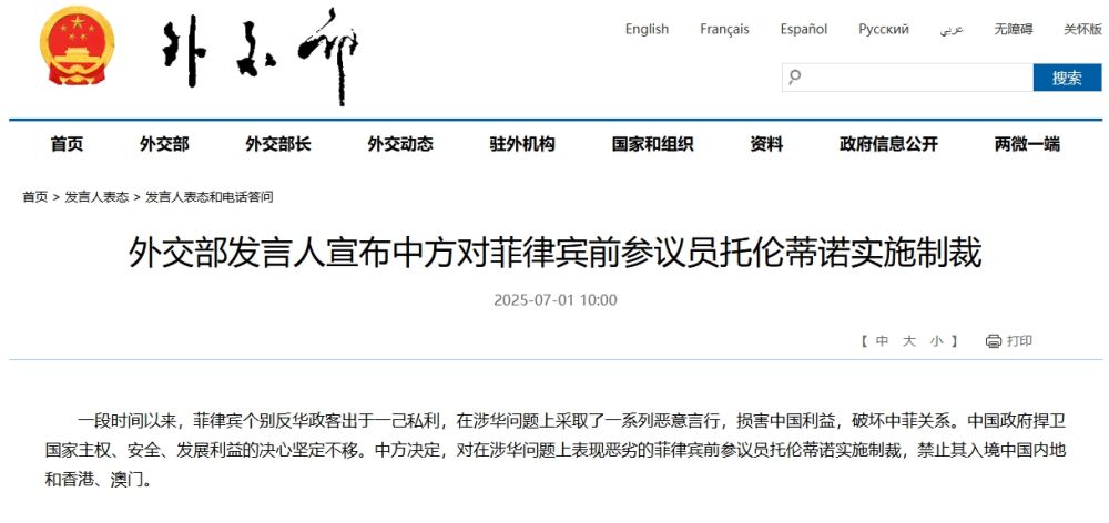 一段时间以来,菲律宾个别反华政客出于一己私利,在涉华问题上采取了一系列恶意言行,损害中国利益,破坏中菲关系。中国政府捍卫国家主权、安全、发展利益的决心坚定不移。中方决定,对在涉华问题上表现恶劣的菲律宾前参议员托伦蒂诺实施制裁,禁止其入境中国内地和香港、澳门。