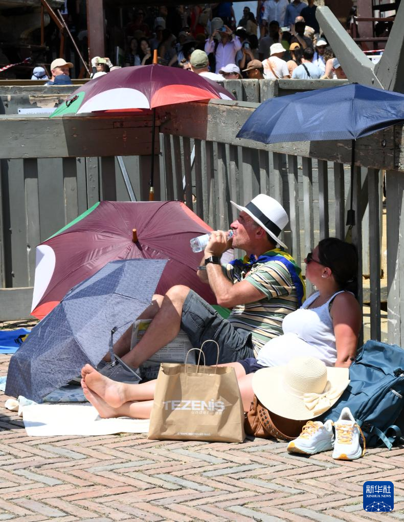 7月2日,在意大利锡耶纳,游客在田野广场冲凉。新华社发(阿尔贝托·林格利亚摄)