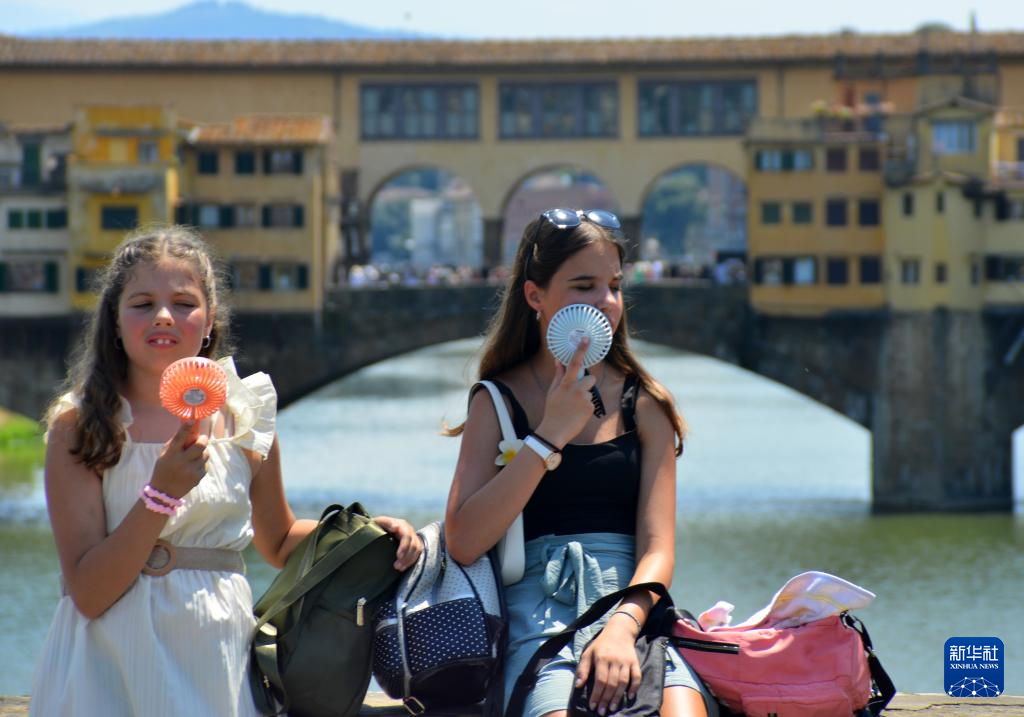 7月2日,在意大利佛罗伦萨,游客使用便携风扇降温。新华社发