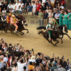 当日,锡耶纳赛马节在意大利托斯卡纳大区古城锡耶纳市中心的田野广场举行,吸引了众多观众前来观看。锡耶纳赛马节是世界闻名的意大利传统民间活动,始于1656年,每年7月和8月举行两次。
