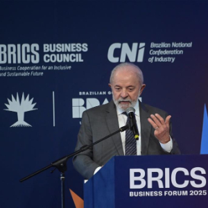 7月5日,巴西总统卢拉在巴西里约热内卢举行的金砖国家工商论坛开幕式上讲话。