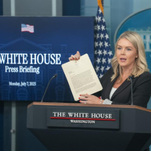 7月7日,在美国首都华盛顿白宫,白宫新闻发言人卡罗琳·莱维特在记者会上展示美国总统特朗普致日本首相的信函。新华社记者胡友松摄