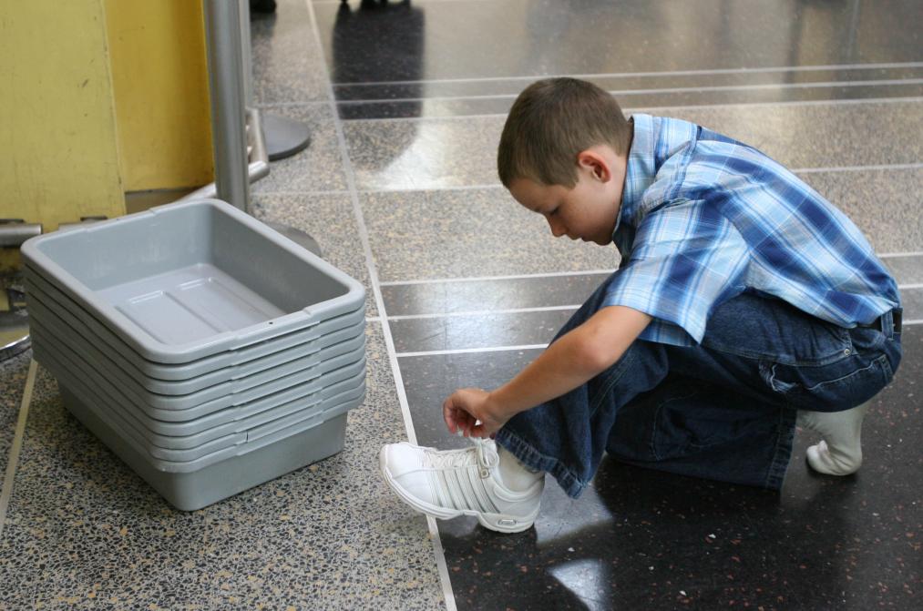 2006年8月10日,在美国首都华盛顿里根机场,一名小男孩在脱鞋准备进行安检。 新华社记者吕明响摄