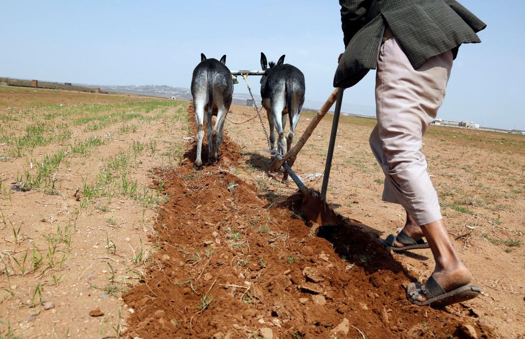 2021年8月11日,一名农民在也门迈赫维省使用驴犁地。新华社发(穆罕默德·穆罕默德摄)