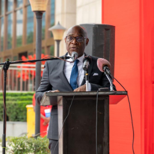 7月11日,刚果(布)财政、预算和国库部长克里斯蒂安·约卡在布拉柴维尔举行的中刚非洲银行开业十周年庆祝活动上致辞。