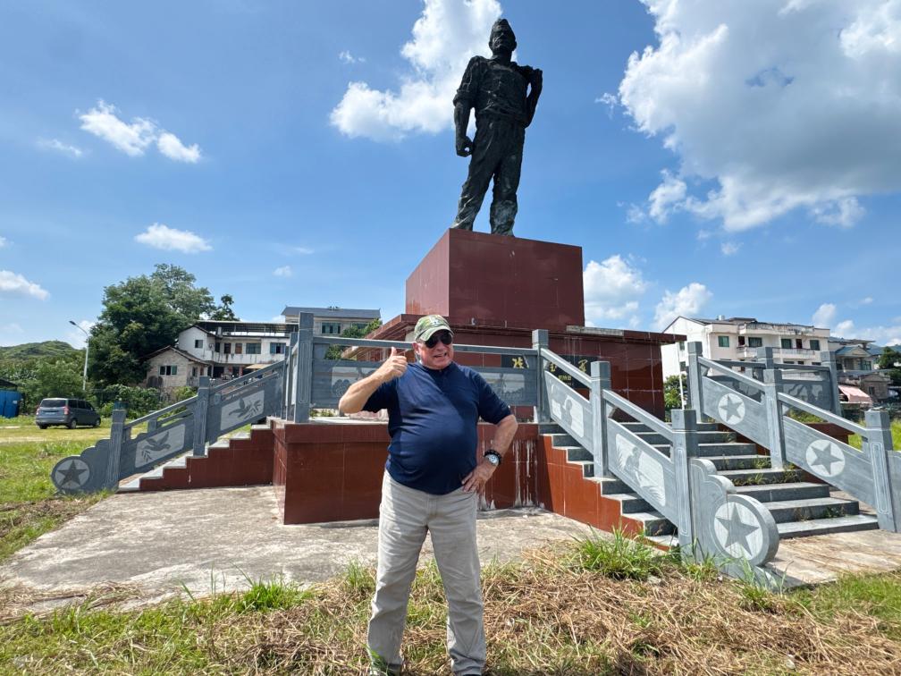 7月16日,美中航空遗产基金会主席杰夫·格林在贵州黄平旧州机场边的陈纳德将军雕像旁留影。新华社记者 周宣妮 摄