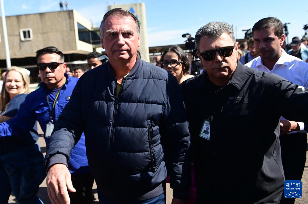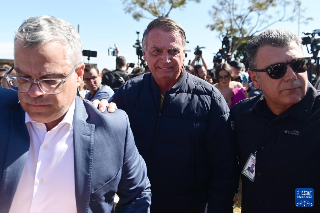 7月18日,在巴西首都巴西利亚,前总统博索纳罗(中)被戴上电子脚镣后离开警方机构。新华社发(卢西奥·塔沃拉摄)