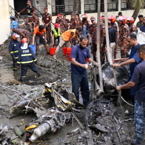 7月21日,在孟加拉国首都达卡,消防员在教练机坠毁现场工作。