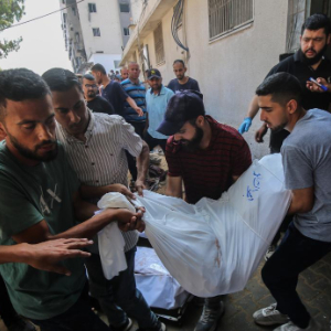 7月23日,人们在加沙城一所医院搬运遇难者遗体。