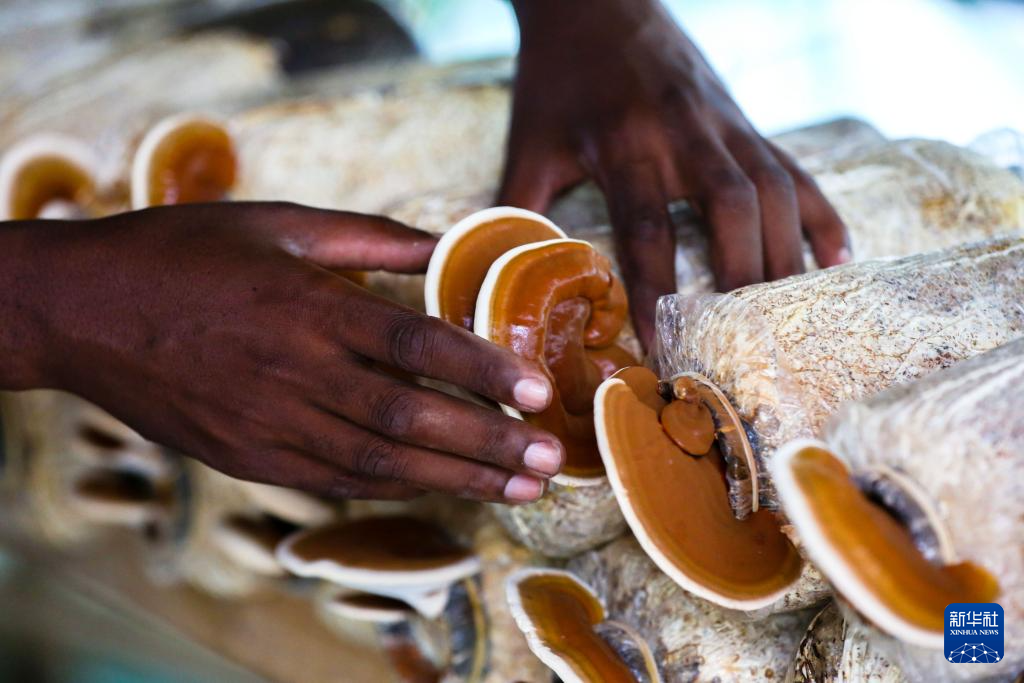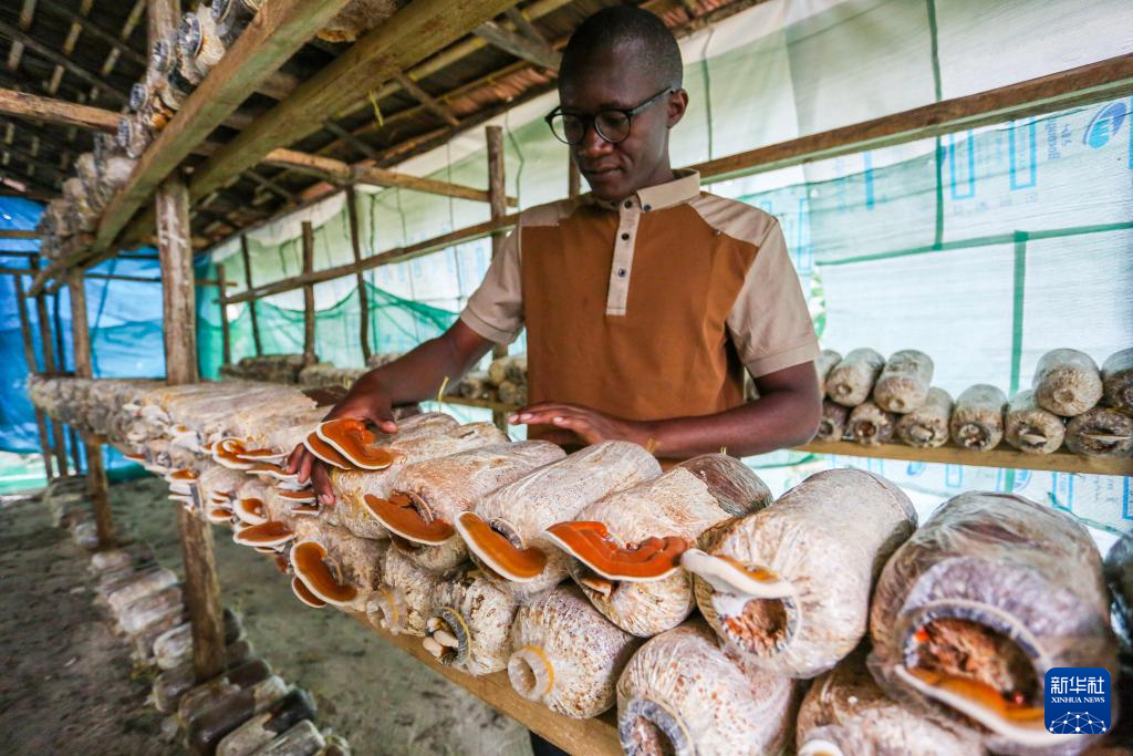 顺着比索马的指引,记者走进一间搭建在稻草屋顶下的菌菇培育棚。木架整齐排列,几百个塑料袋里冒出棕红色的灵芝,边缘泛着白,带着生命的力量静静绽放。